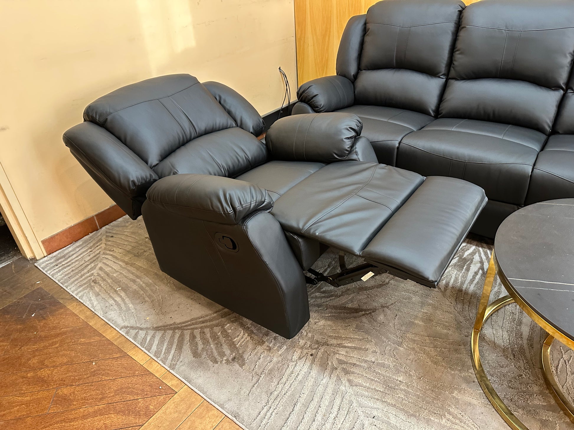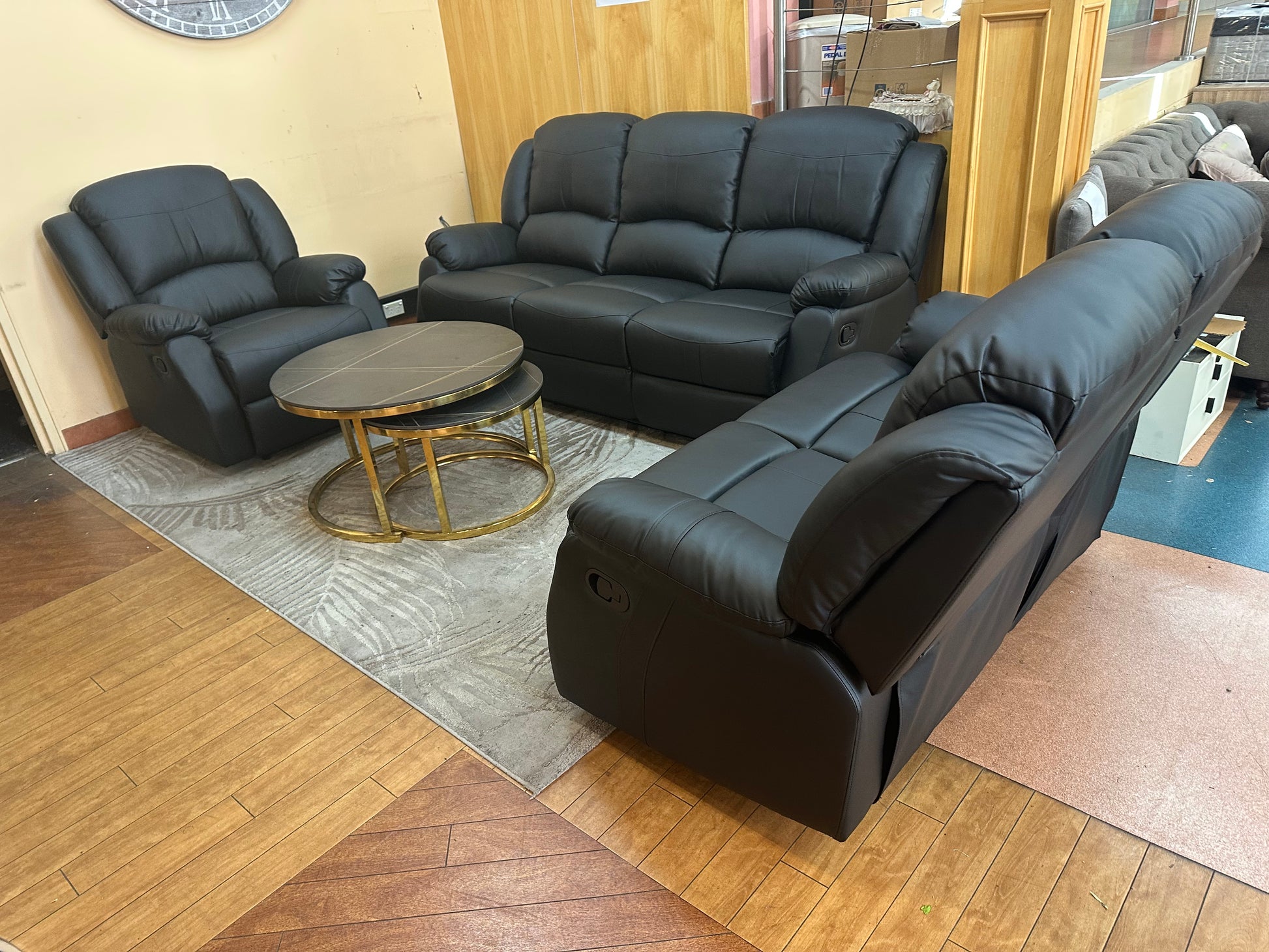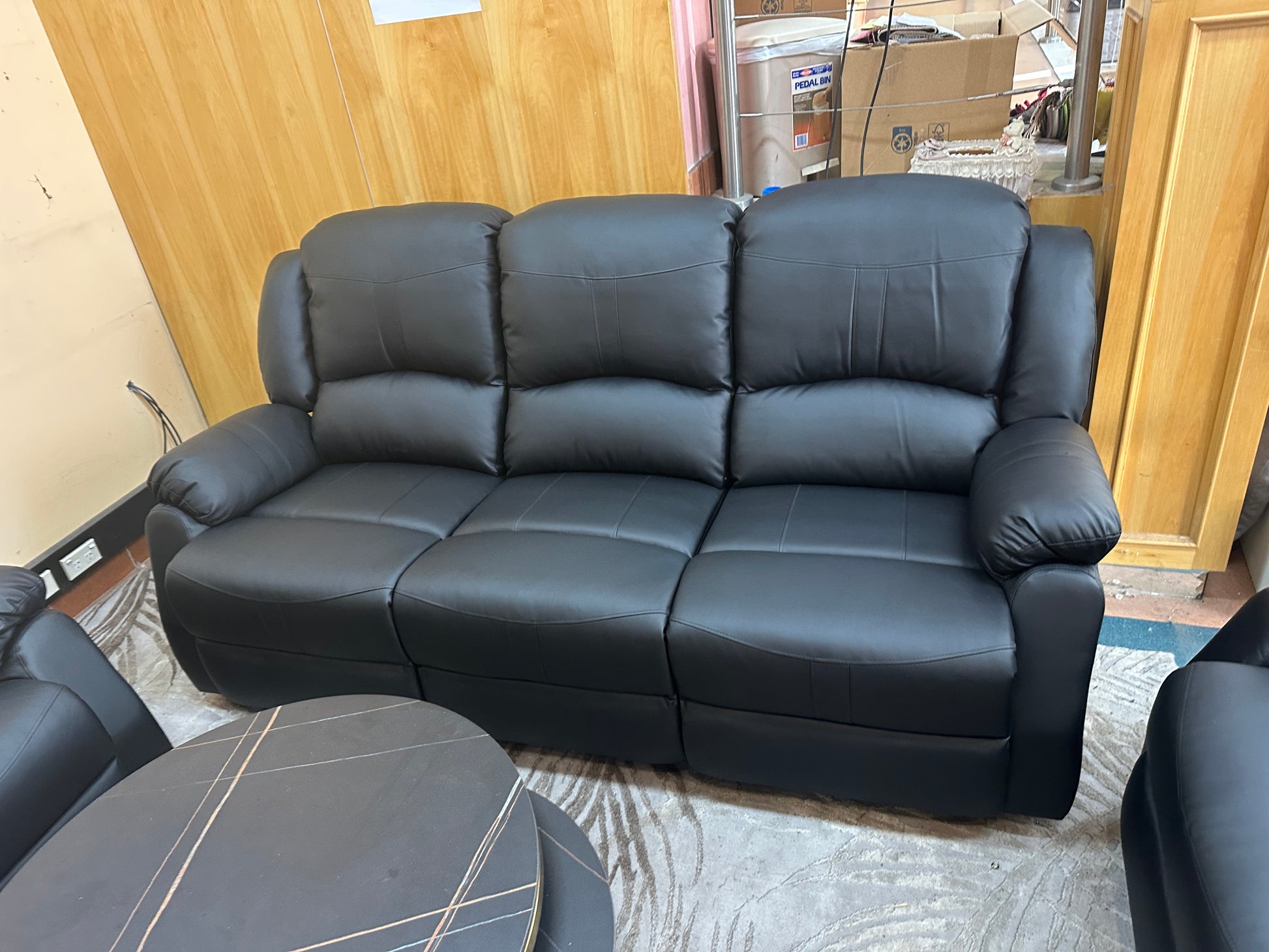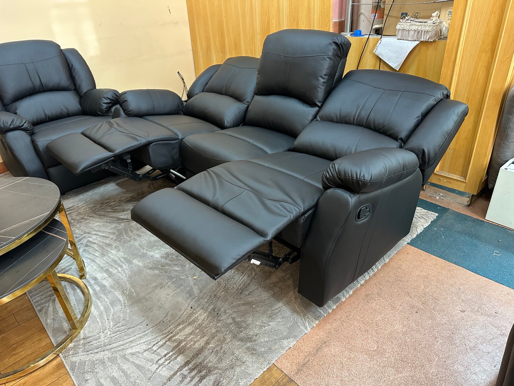 Introducing our exquisite **Black PU leather extremely comfortable recliner sofa set* where timeless luxury meets unparalleled comfort. With its rich high quality PU leather and stunning manual recliners, this statement piece is designed to elevate any room in your home, making it the perfect blend of sophistication and style.