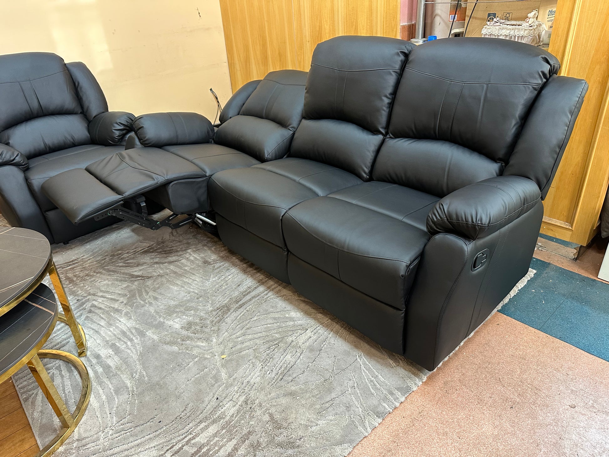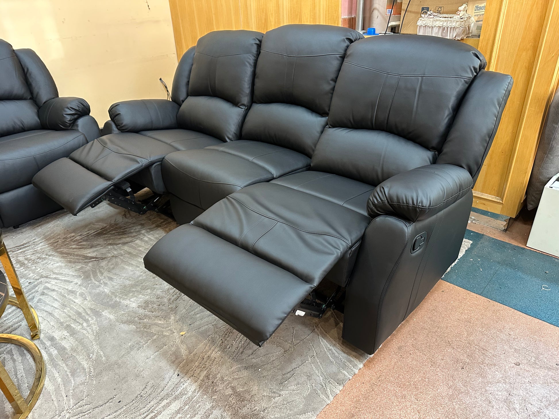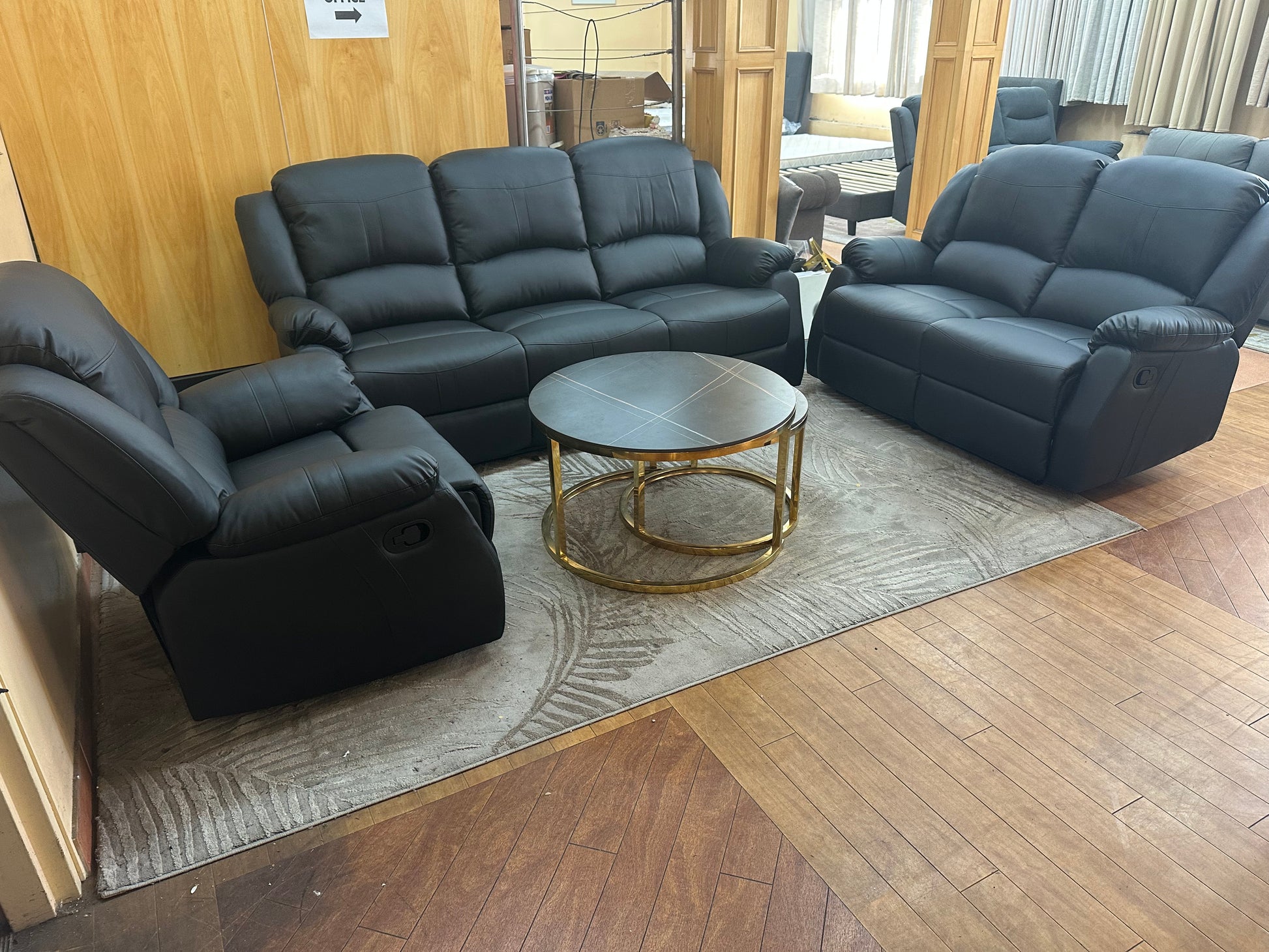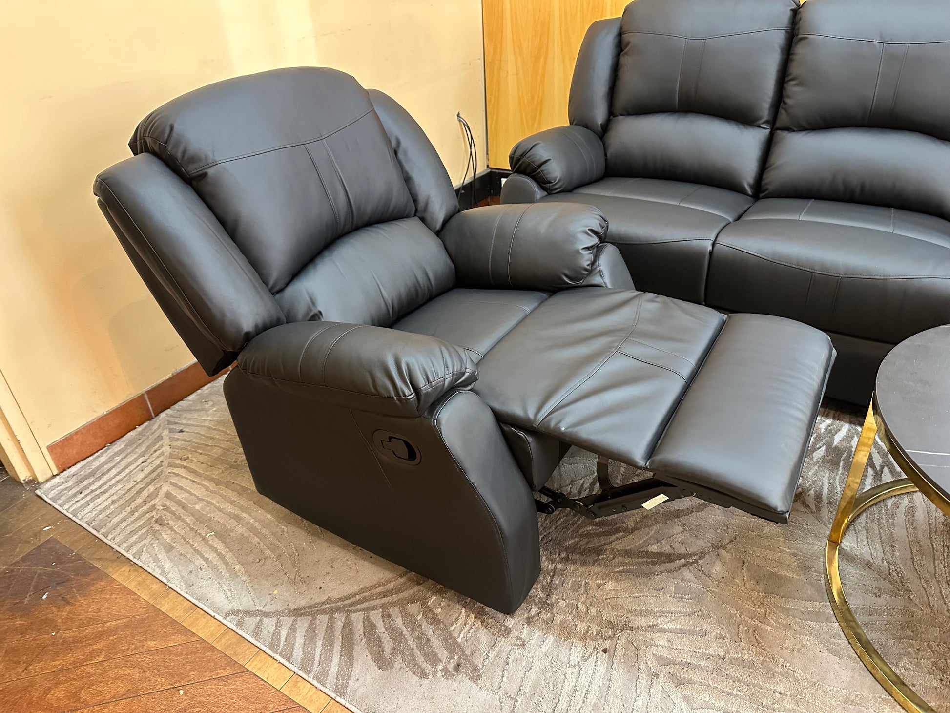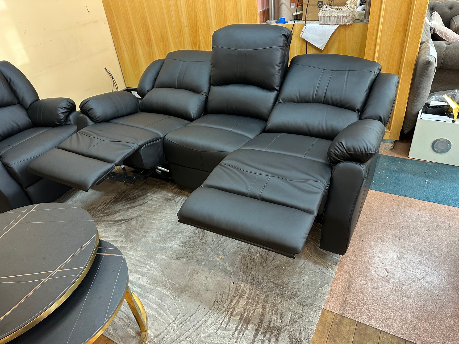Introducing our exquisite **Black PU leather extremely comfortable recliner sofa set* where timeless luxury meets unparalleled comfort. With its rich high quality PU leather and stunning manual recliners, this statement piece is designed to elevate any room in your home, making it the perfect blend of sophistication and style.