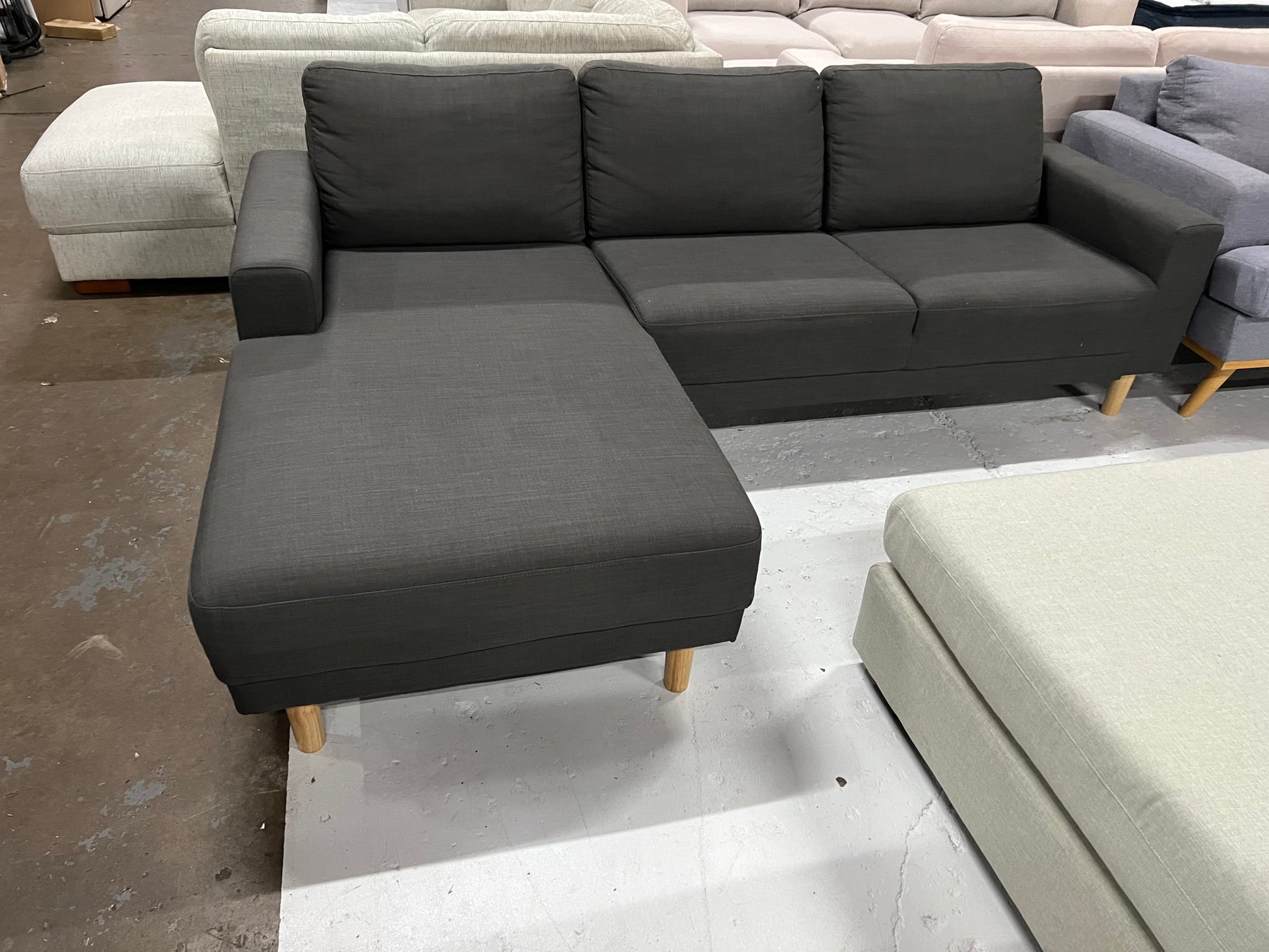 Perfect condition Dark grey chaise L Shape sofa. Beuatiful natural fabric dark grey colour all the back cushion covers are removable and Machine washing the sofa size is 2.3 m wide and size is 1.55 Delivery and installation available you are welcome to come and inspect This Sofa is slightly preowned but perfect condition as new has been professionally clean and ready to go