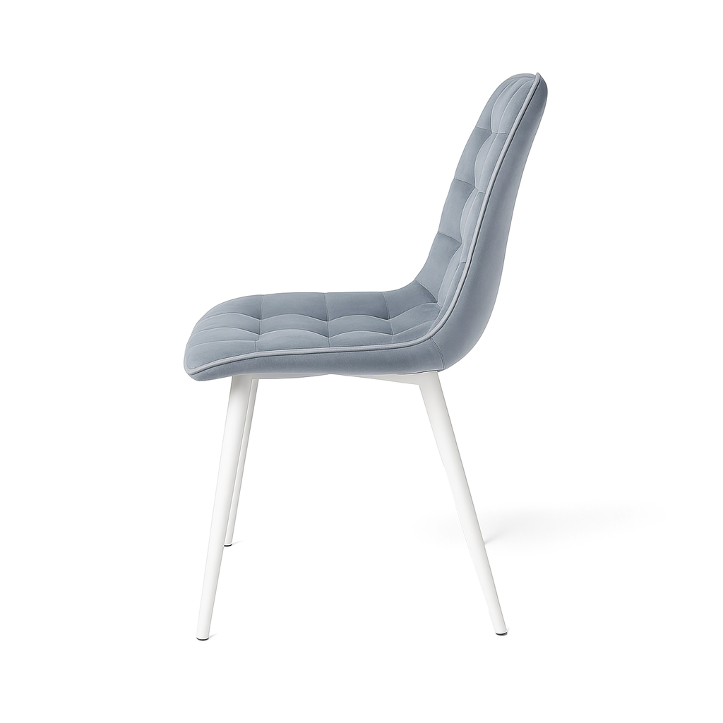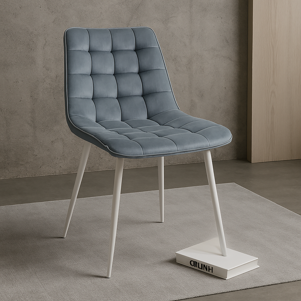 Paired with four blue-grey velvet chairs, each piece offers plush comfort and chic style. The chairs feature padded diamond-stitched seat pads and white powder-coated metal legs, combining durability with a contemporary aesthetic.