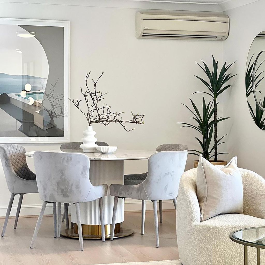 Aurora Luxe 5-Piece Round Dining Set – White Sintered Stone Table with Velvet Chairs (Light Grey)
