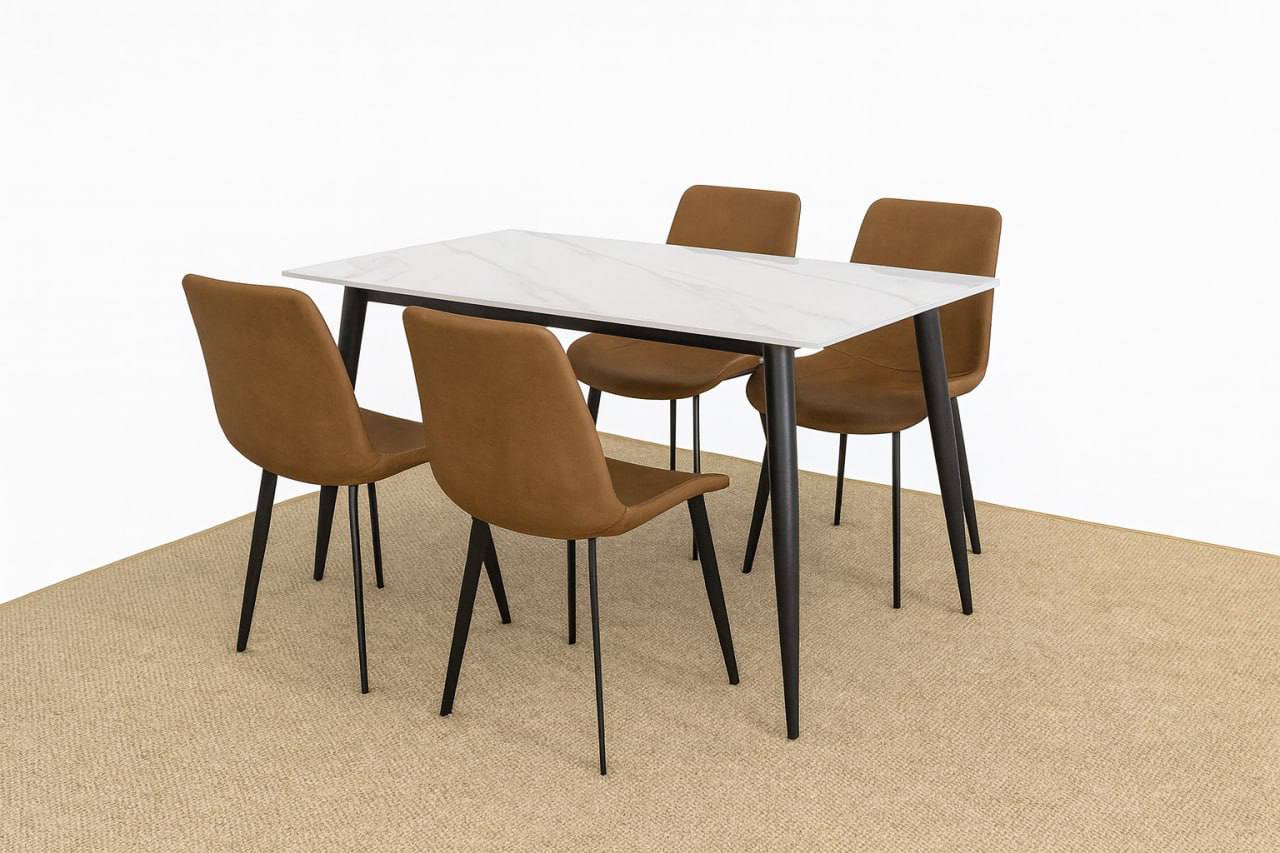 Marble-Top Dining Table with 4 Upholstered Chairs – Designed with a sleek black metal base and soft mocha-tone seating, blending modern style with everyday durability.