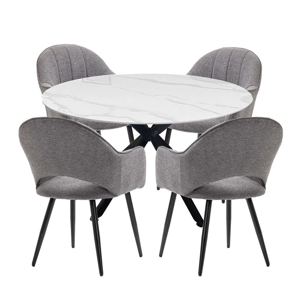 Luna 5-Piece Round Dining Set – White Sintered Stone Top with Grey Fabric Chairs & Black Metal Base