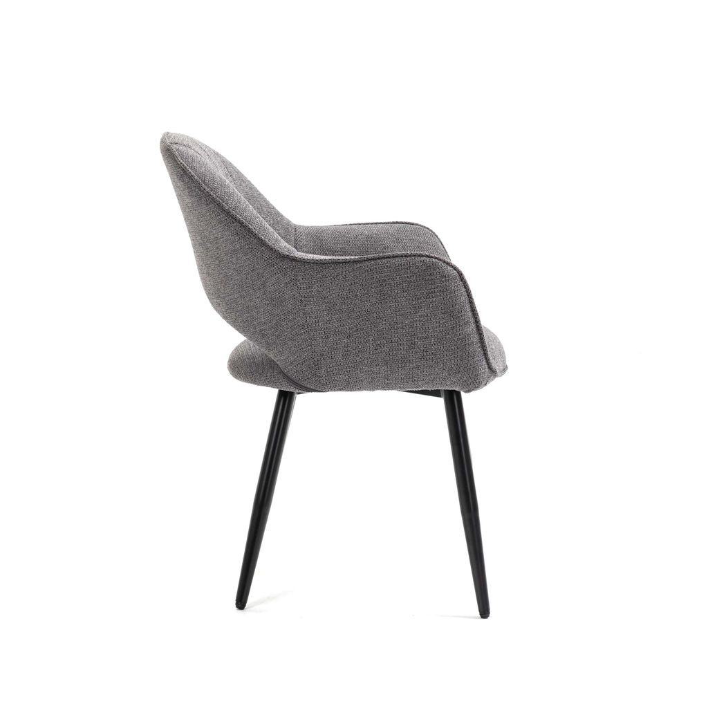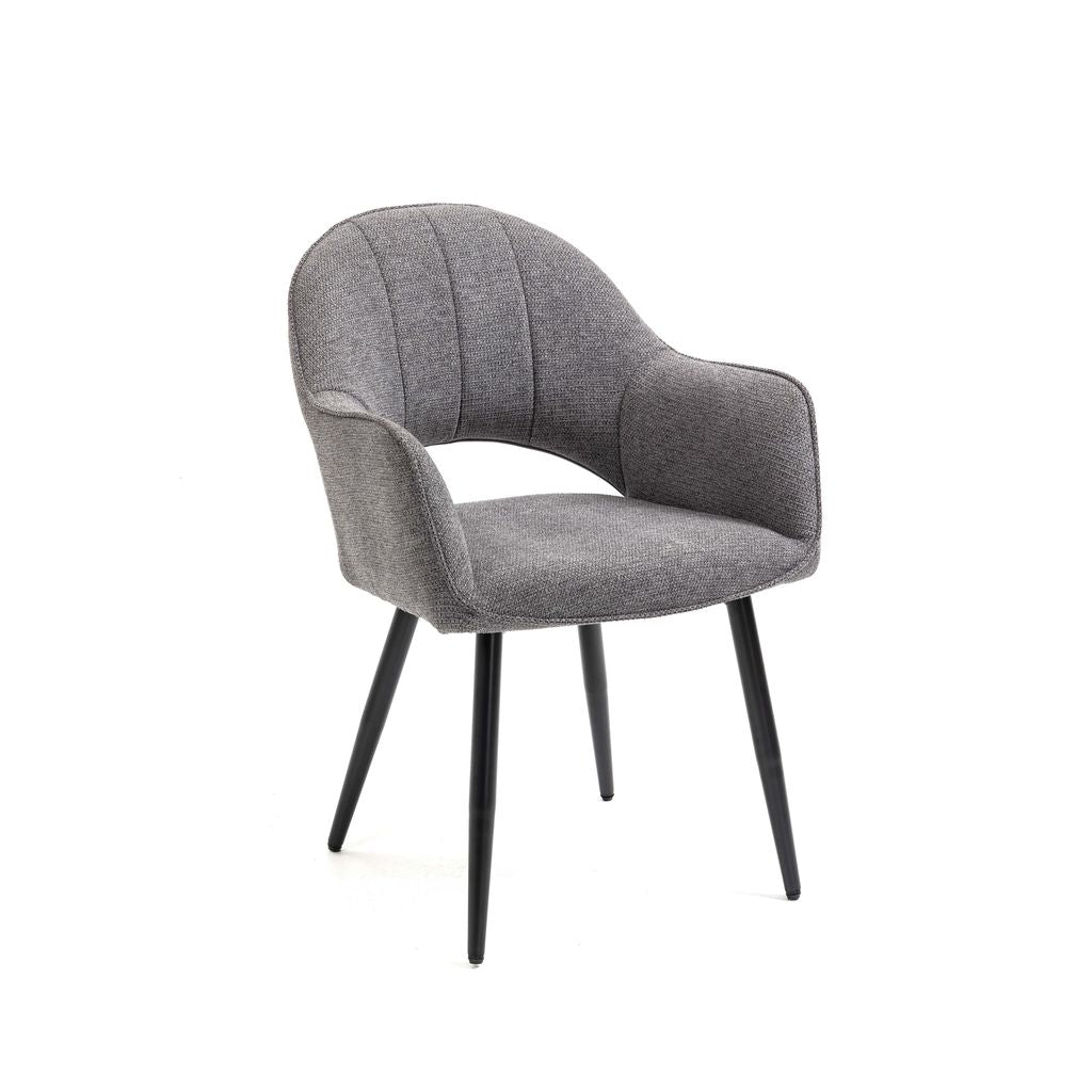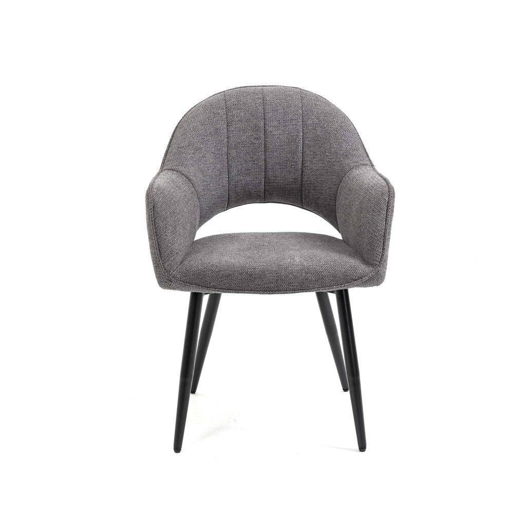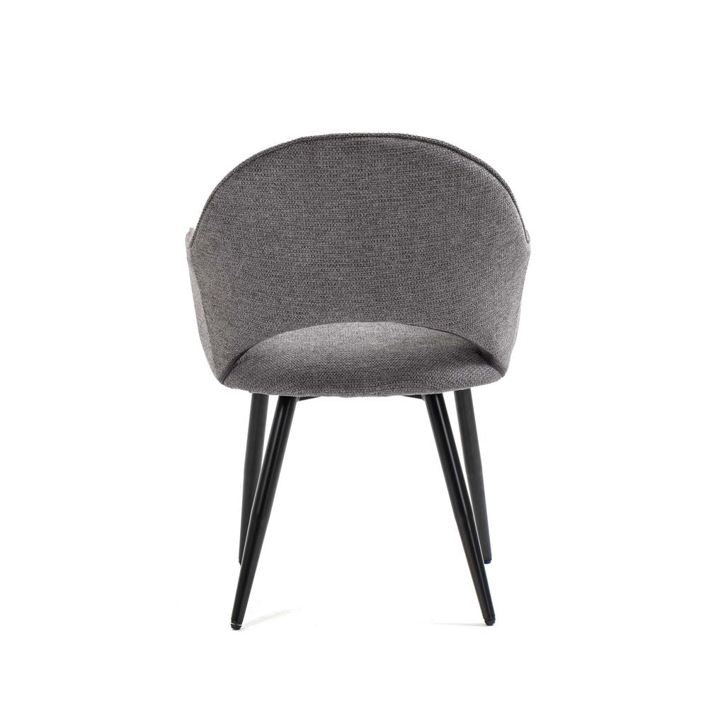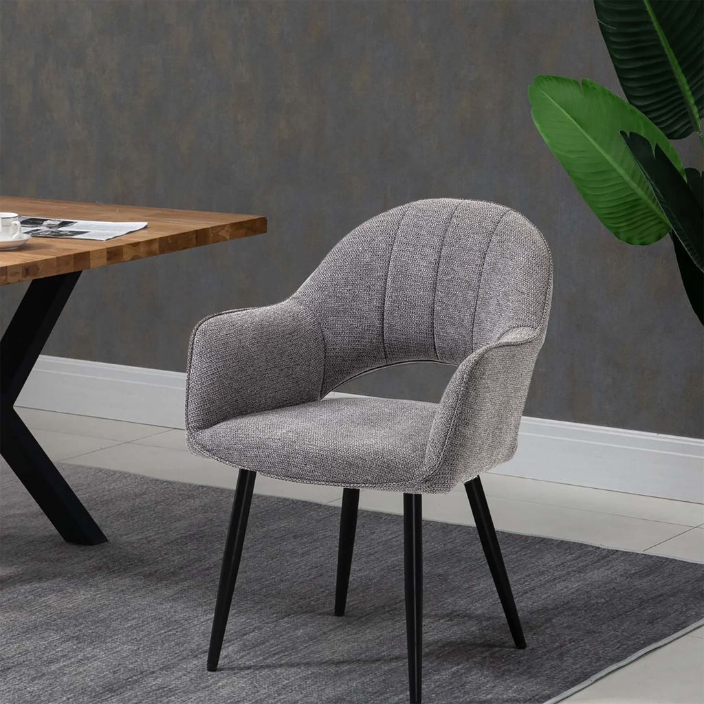 The black powder-coated metal base features a minimalist cross-leg design that enhances stability while adding a bold, contemporary touch. Complementing the table are four elegant grey fabric dining chairs, crafted with curved backs and soft padding for superior comfort and support.