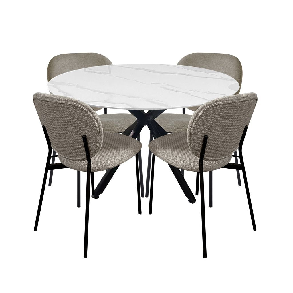 Luna 5-Piece Round Dining Set – White Sintered Stone Top with Taupe Fabric Chairs & Black Metal Base